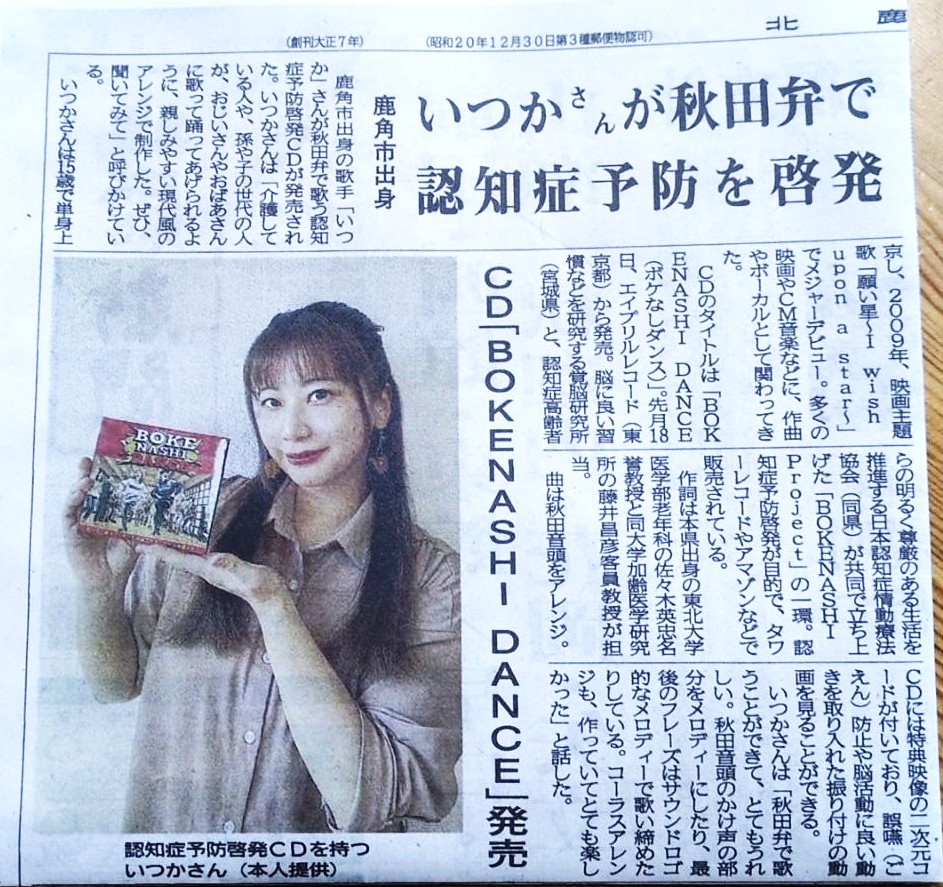 CD発売情報が北鹿新聞に掲載! 2026年3月8日 最終更新日時 : 2026年3月8日 覚脳研究所 秋田県の北鹿新聞にCD発売情報が歌手いつかさんの写真と、インタビューと共に掲載されました。 FacebookXBluesky
